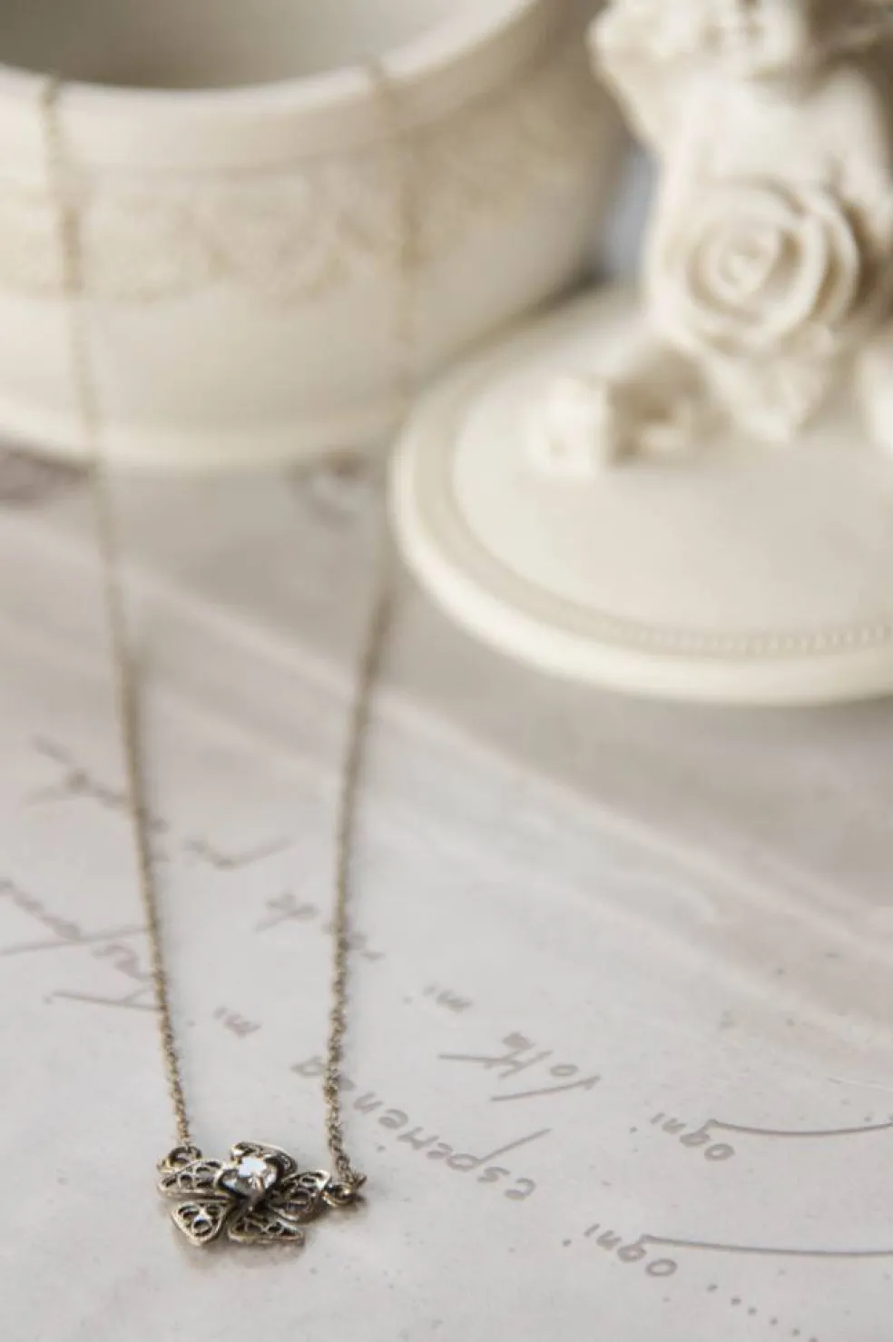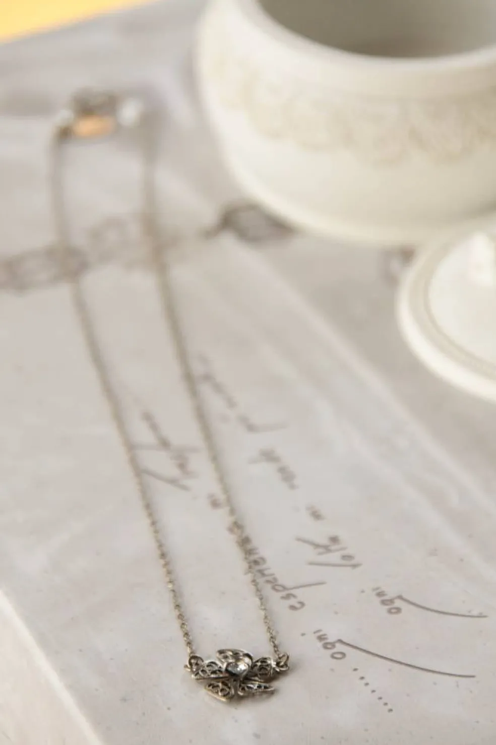 Zilveren bloemetje in filigraan met witte Zirkoon in het midden.
