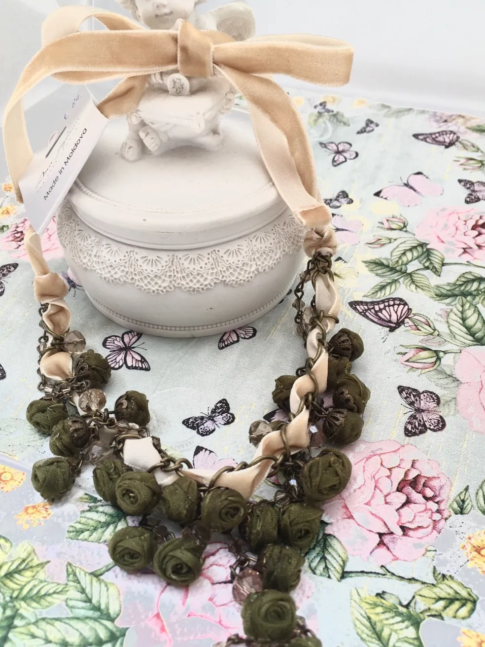 Halsketting van Ana Popova met groene, stoffen bloemetjes.