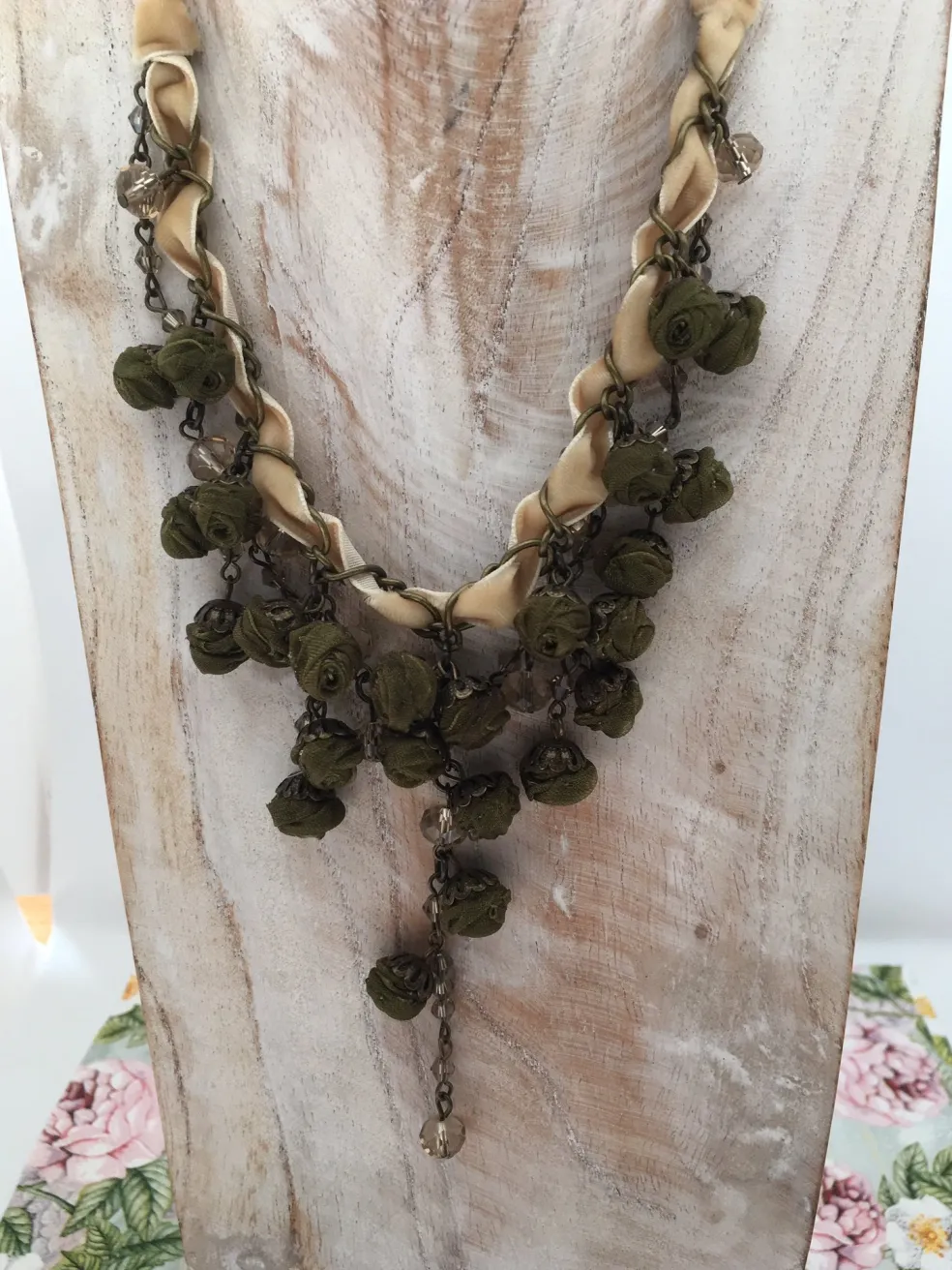 Halsketting van Ana Popova met groene, stoffen bloemetjes.Bronzen ketting met beige, velours lint.Lengte is aanpasbaar.