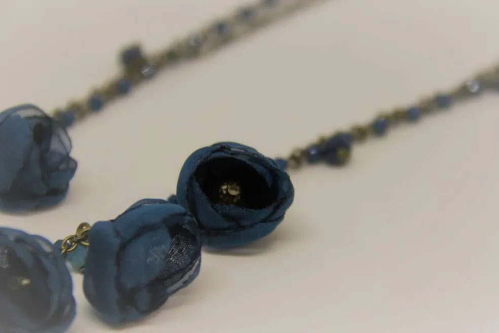 Petroleum blauwe halsketting van Ana Popova.Bronzen ketting met blauwe glaskralen en textiel.Lengte=70cmKleur:Bleu de ch…