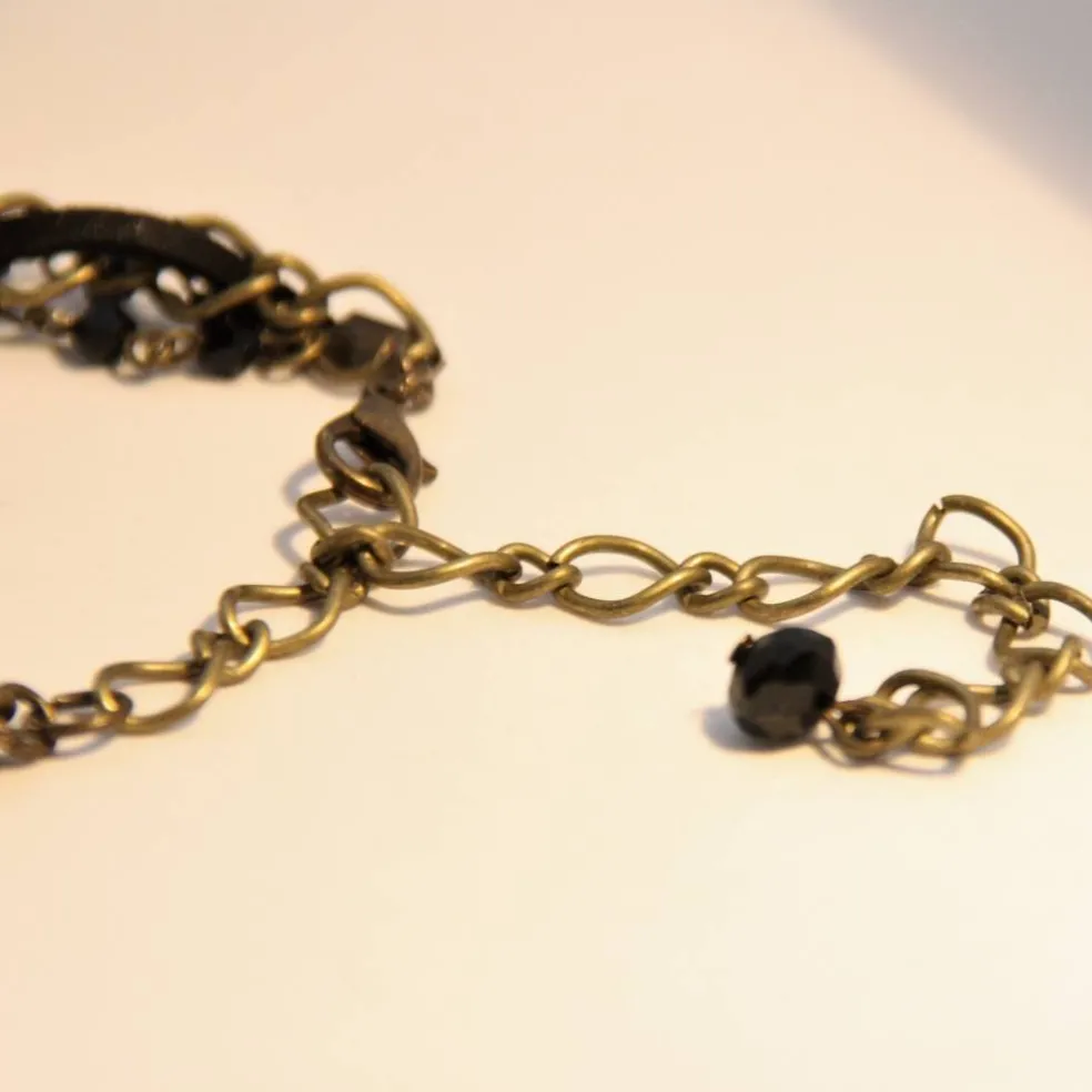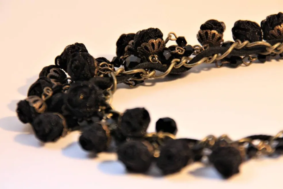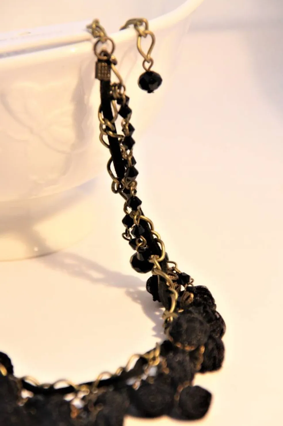 Zwarte halsketting van Ana Popova.Bronzen ketting met zwarte glaskralen en textiel.Lengte=34cm+11cm