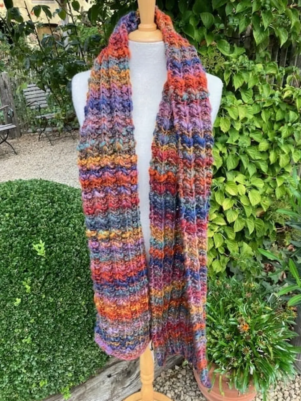 Sjaal gebreid door Lieve van de Amberhoeve.53% wol, 47% AcrylBlauw,paars,geel,oranje,..L=160cm B=24cmÂ