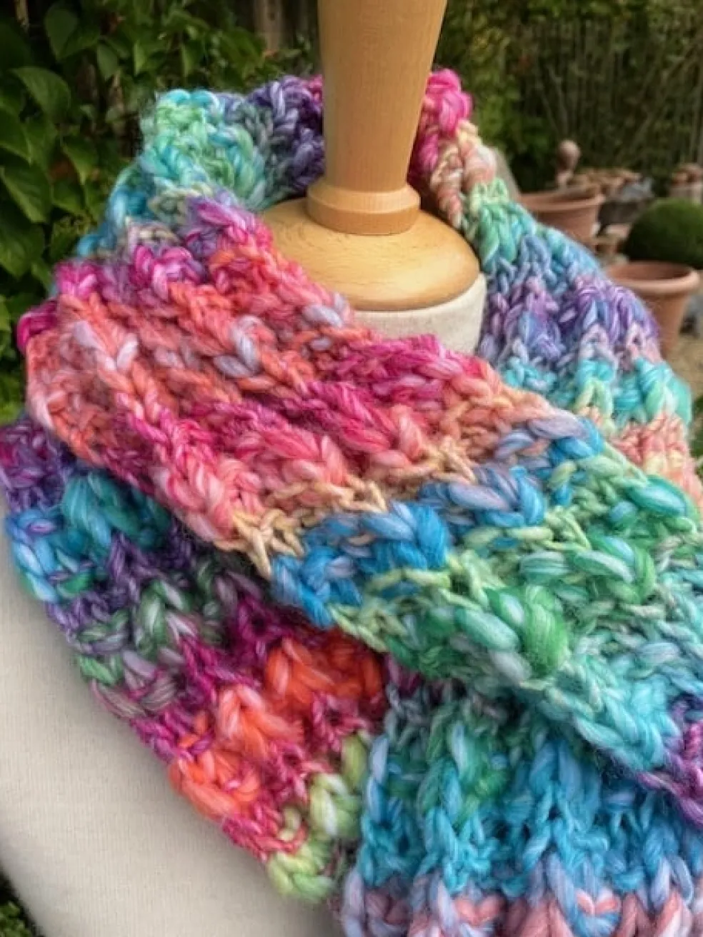 Sjaal gebreid door Lieve van de Amberhoeve.53% wol, 47% AcrylBlauw,paars,roze,groen,oranje,..L=170cm B=23cm …