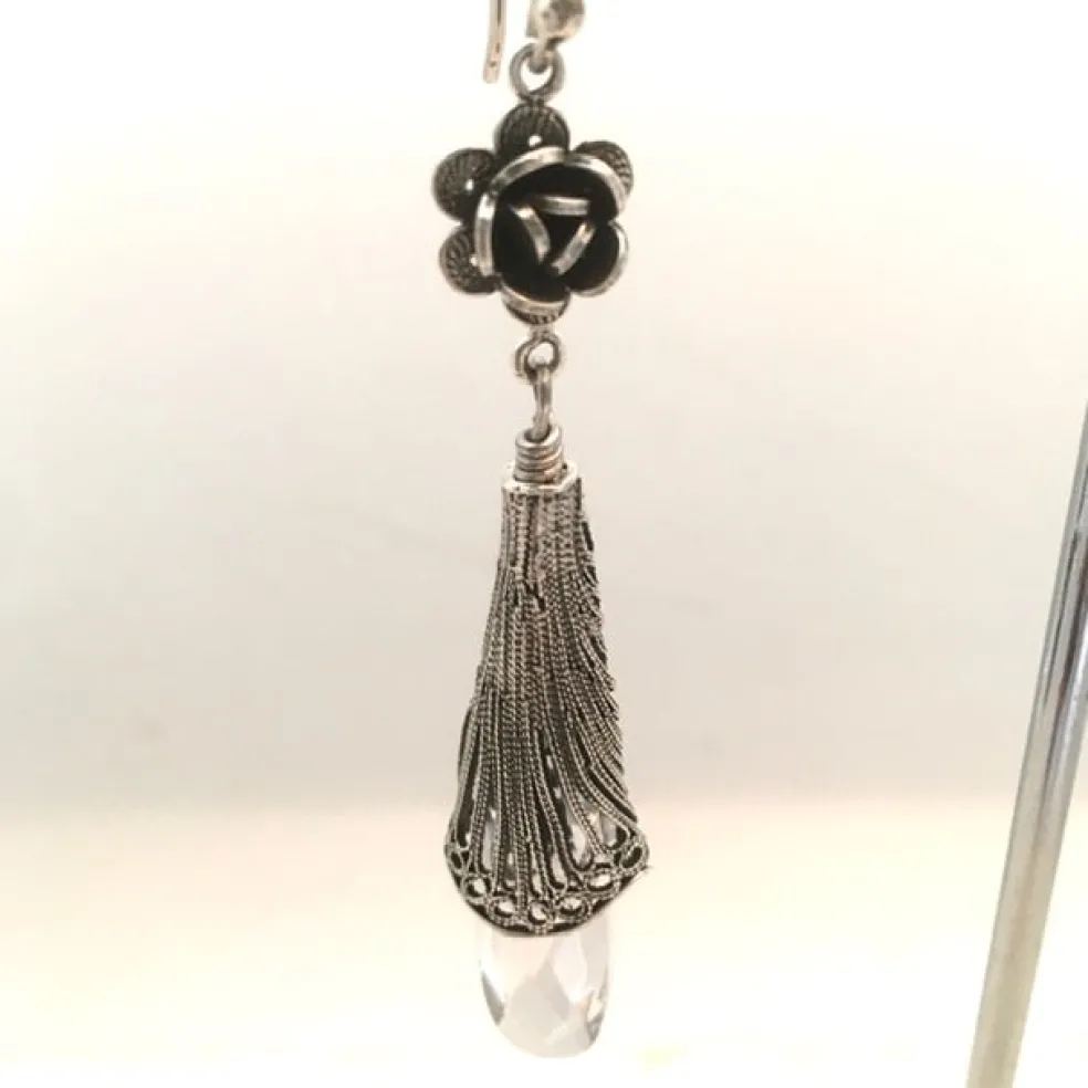 Lange, zilveren oorbellen van Yvone Christa.Roos bovenaan met grote Zirkoon hanger (doorzichtig)De Zirkoon is omgeven do…